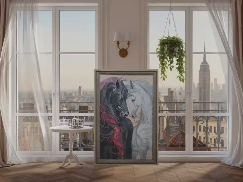 Eternal Balance explores harmony through contrast. The black and white horses stand face to face, embodying opposing forces—strength and serenity, intensity and calm—held together in perfect equilibrium. The flowing mane, touched with deep crimson, introduces emotion and movement, suggesting the pulse of life that connects all dualities.
