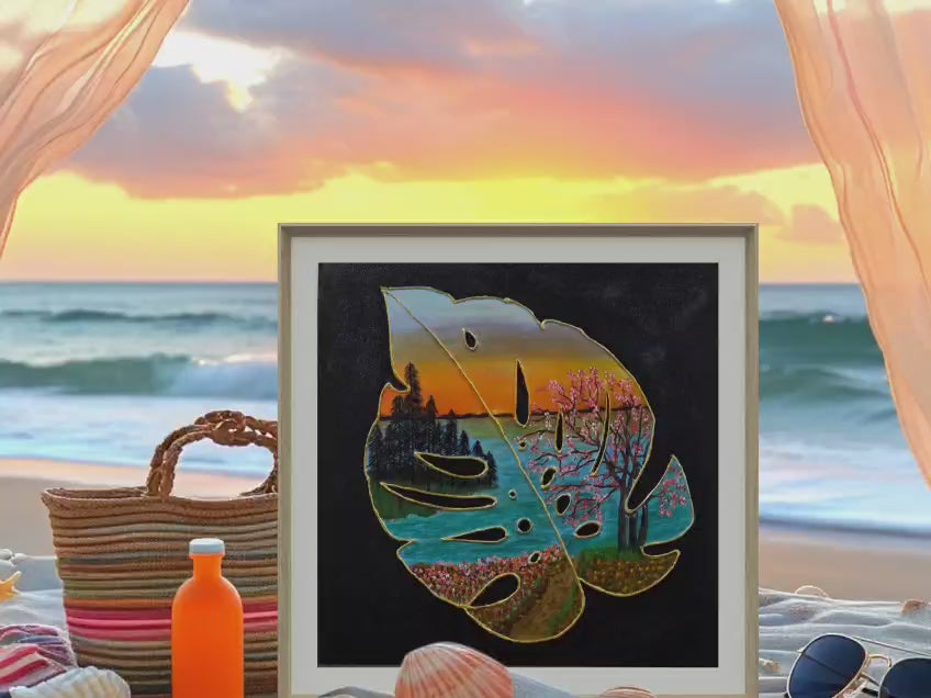 A poetic reflection of nature captured within a single leaf, symbolizing the universe hidden in small, precious moments. This artwork reveals the vast beauty of mountains, water, sky, and light reflected delicately within a leaf. It represents the idea that every small element of nature carries infinite stories. Through this composition, the artist invites viewers to slow down and rediscover life’s quiet miracles.