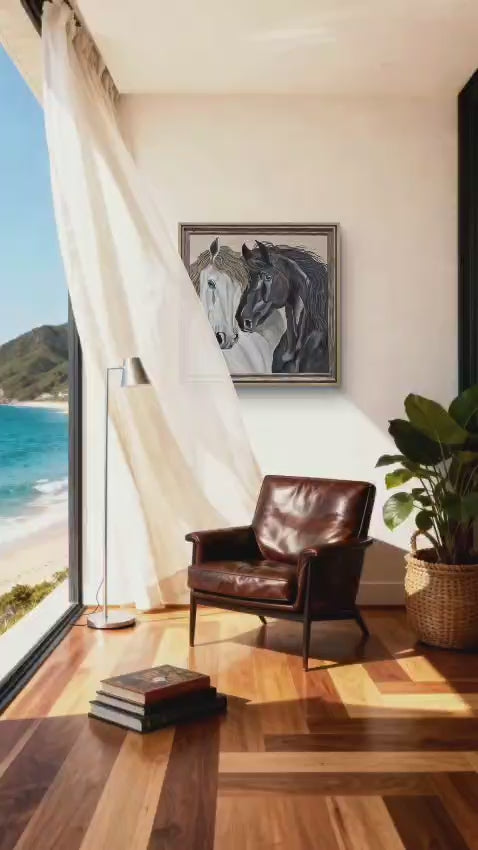 This painting captures a silent dialogue between two souls connected beyond language. The contrasting horses—light and dark—stand close, not in motion, but in mutual understanding. Their proximity speaks of trust, companionship, and an emotional bond that requires no expression.